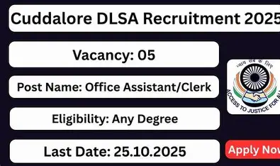 The District Legal Services Authority (DLSA), Cuddalore has released the Cuddalore DLSA Recruitment 2025 Notification for 05 vacancies including Chief Legal Aid Defense Counsel, Deputy Chief Legal Aid Defense Counsel, Assistant Legal Aid Defense Counsel, and Office Assistant/Clerk posts.