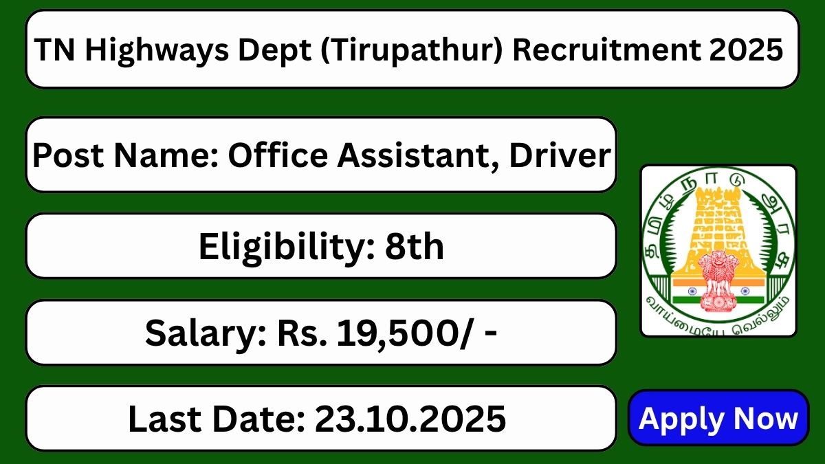 The TN Highways Department (Tirupathur) has released its 2025 recruitment notification for 01 Office Assistant post reserved for the ST community. Candidates aiming for a Tamil Nadu government job should apply promptly. Applications are offline and must reach the department before 23.10.2025 at 05.45 PM.