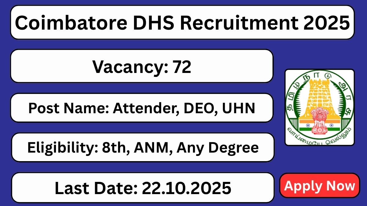 The Coimbatore District Health Society (DHS) has released the Recruitment 2025 Notification for 72 posts, including DEO, Accounts Assistant, UHN, Attender, Multipurpose Worker, Data Assistant, Dispenser, Therapeutic Assistant, and various Doctor positions.