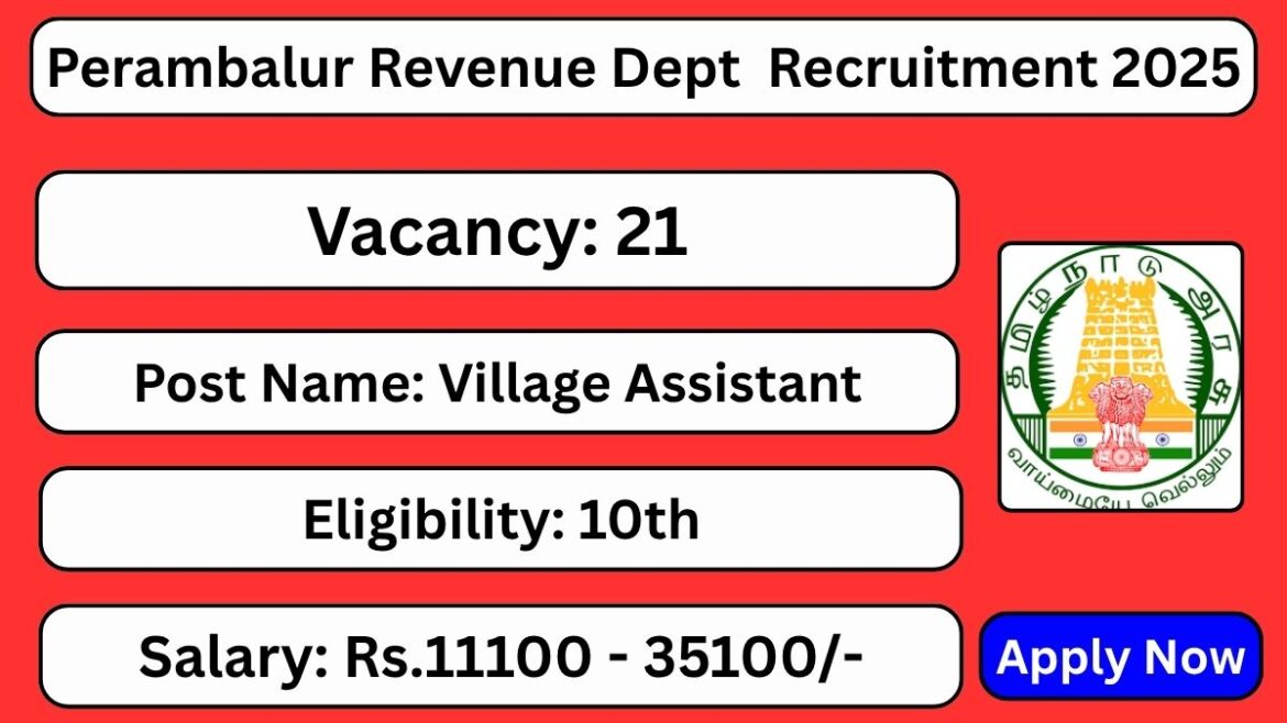 The Perambalur Revenue and Disaster Management Department has announced 21 Village Assistant vacancies. Interested candidates can download the application form in PDF format from the official website Perambalur.nic.in. The deadline to submit the filled application along with enclosures is 24.10.2025 at 05.45 PM.