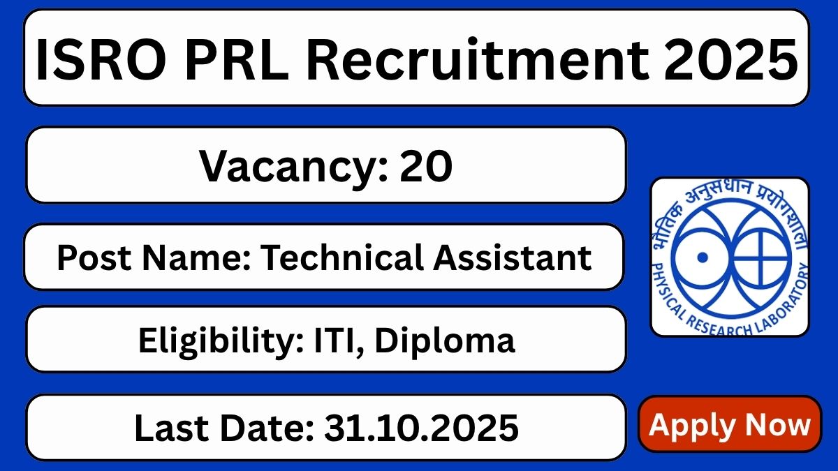 The ISRO – Physical Research Laboratory (PRL) has announced the recruitment of 20 Technical Assistant and Technician-B posts under Notification No: 02/2025. The application process will be conducted online at the official website www.prl.res.in from 04.10.2025 at 10:00 AM to 31.10.2025 at 11:59 PM. Interested candidates must review the official notification, verify eligibility, and apply before the deadline.