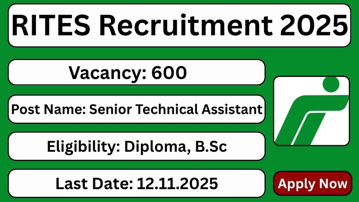 RITES Ltd has announced 600 vacancies for Senior Technical Assistant posts through Notification No: M/61-88/25. The recruitment is on a contract basis and applications are invited online from 14.10.2025 to 12.11.2025. Candidates must check the eligibility criteria before applying.