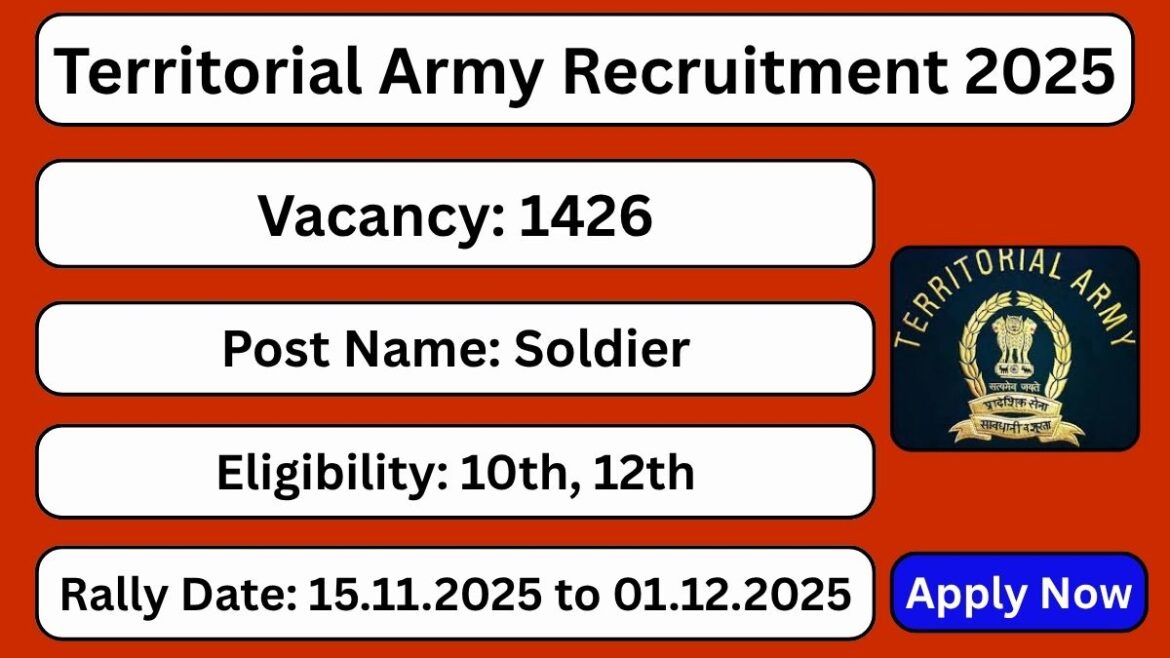 The Territorial Army Recruitment Rally 2025 has been officially announced to fill 1426 Soldier vacancies across multiple trades. Interested candidates must download the application form in PDF format from the official website www.ncs.gov.in. The filled form along with required documents should be submitted between 15.11.2025 and 01.12.2025. Applicants must carefully read the notification and confirm eligibility before applying.