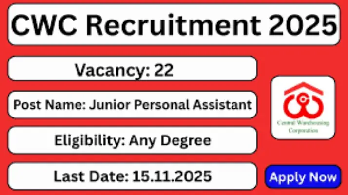 The Central Warehousing Corporation (CWC) has announced the CWC Recruitment 2025 Notification (No: CWC/I-Manpower/DR/Rectt/2025/01) for 22 vacancies. Eligible candidates can apply for the Junior Personal Assistant (JPA) and Junior Executive (Rajbhasha) posts from October 17, 2025, to November 15, 2025, through the official website https://www.cwceportal.com/.
