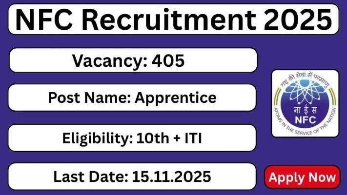 The Nuclear Fuel Complex (NFC), Hyderabad has released the NFC Recruitment Notification No: NFC/R-III/1/10/2025 to fill 405 Apprentice Posts. Interested and eligible candidates can apply online through the official website https://www.nfc.gov.in/ from 28.10.2025 to 15.11.2025.
