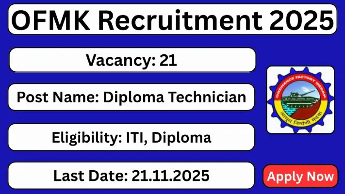 The Ordnance Factory Medak (OFMK) has released its Recruitment Notification 2025 (No: FMK/FTB/JT/2025/03) for 21 vacancies across multiple technical roles. Candidates interested in Central Government Jobs can apply offline before 21st November 2025.